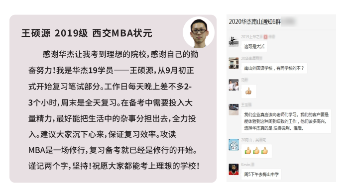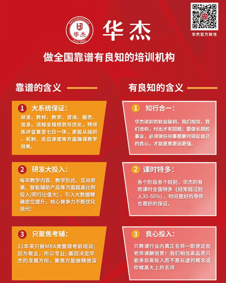 华杰多年命中联考真题,但比命中真题更重要的是华杰对历年命题方向的把握与洞悉,让学员少走弯路;比华杰368位联考状元更重要的是华杰学员比同类机构学生平均高10-20分。